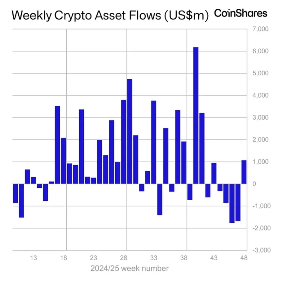 Согласно данным аналитиков CoinShares, с 21 по 28 ноября приток капитала в криптовалютные инвестиционные продукты достиг 1,07 миллиарда долларов США, что прервало четырехнедельный период оттоков на общую сумму 5,7 миллиарда долларов США.