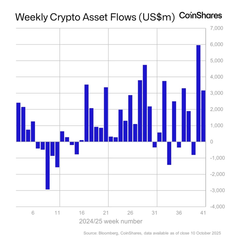 Согласно отчету аналитиков CoinShares, с 4 по 10 октября приток средств в криптовалютные инвестиционные продукты составил 3,17 миллиарда долларов США.